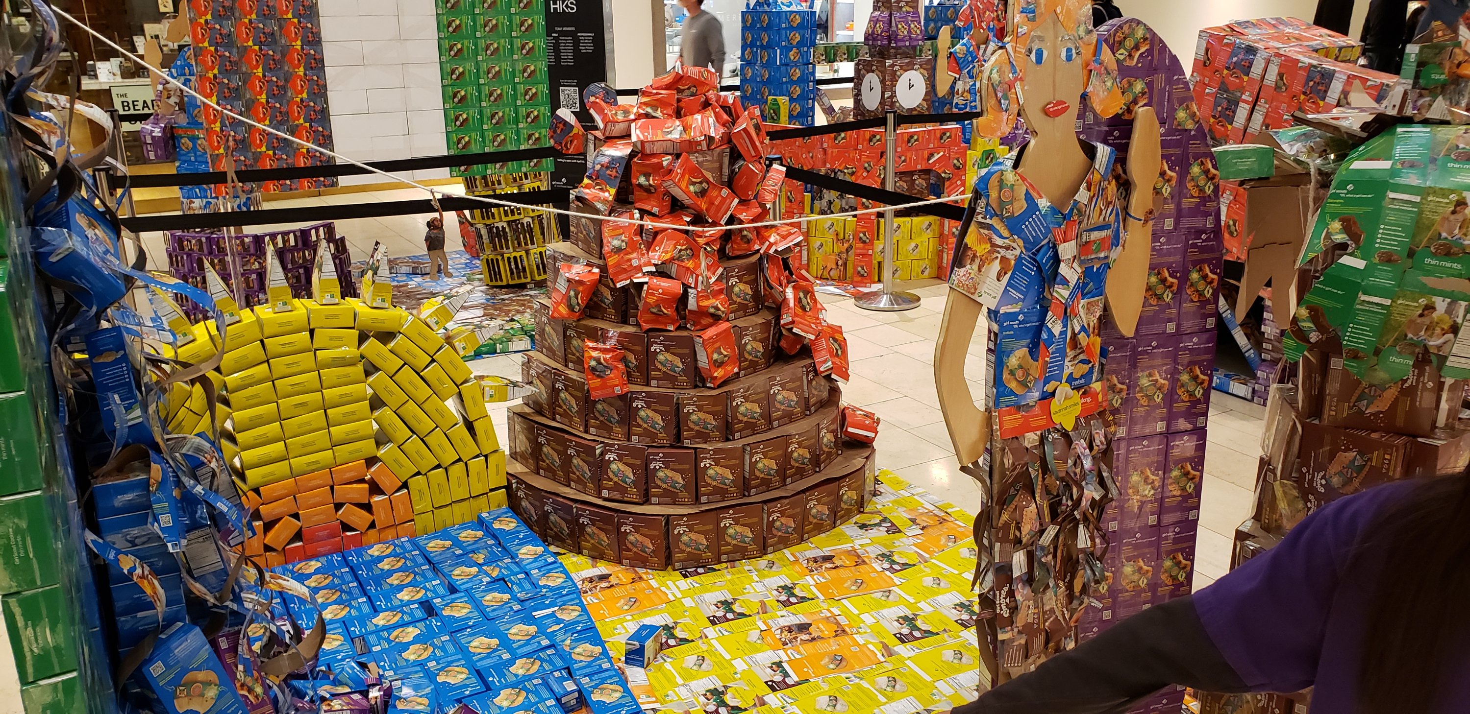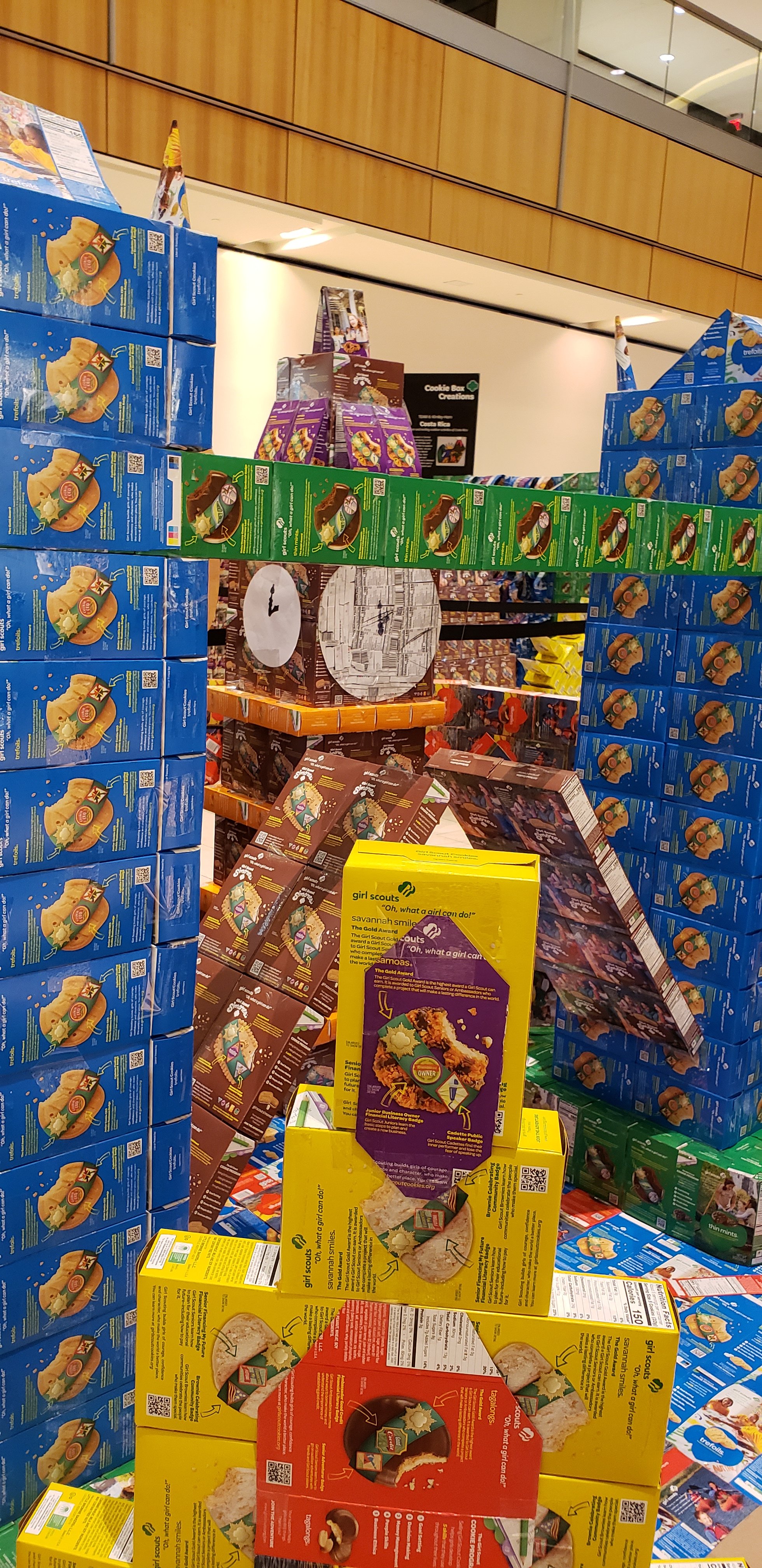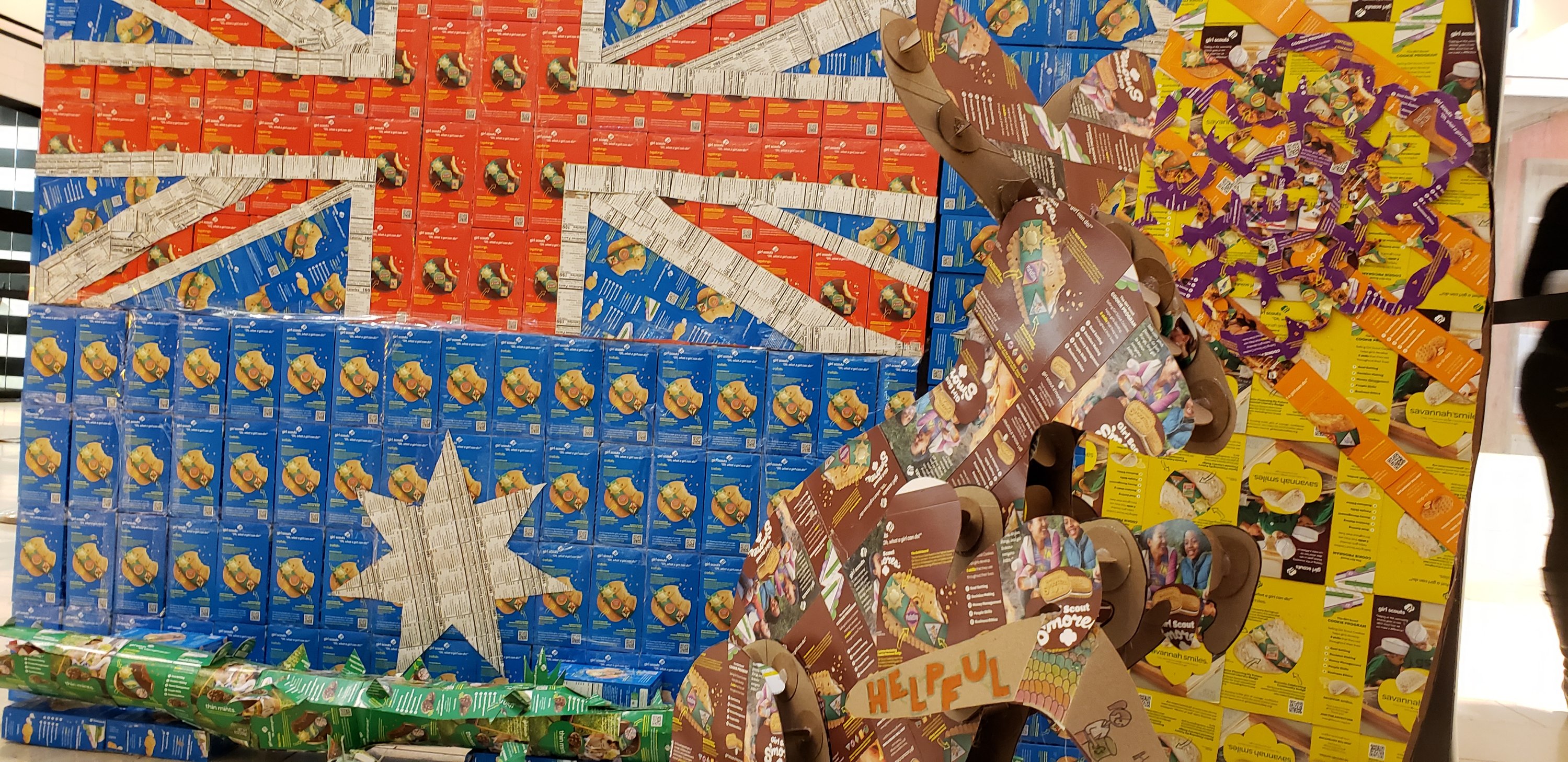 At the Galleria Mall in Dallas, the kids and I found this awesome artistic display of countries represented by Girl Scout Cookies boxes. I’m not sure what the point of this art was as I was in a bit of a hurry and didn’t read any of the displays, but since when does art need a point?